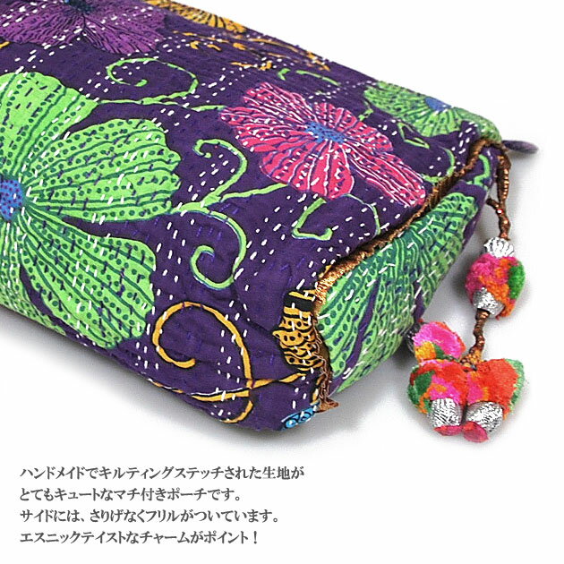 タテ約25cm×ヨコ約34cm/サイドマチ:8cm/底マチ:12cm コットン/プラスチックビーズ 「発展途上国の美しいハンドクラフト作品を世界中の人々に知ってもらう」をコンセプトにした、インド発ハンドメイドのキュートなポーチです。