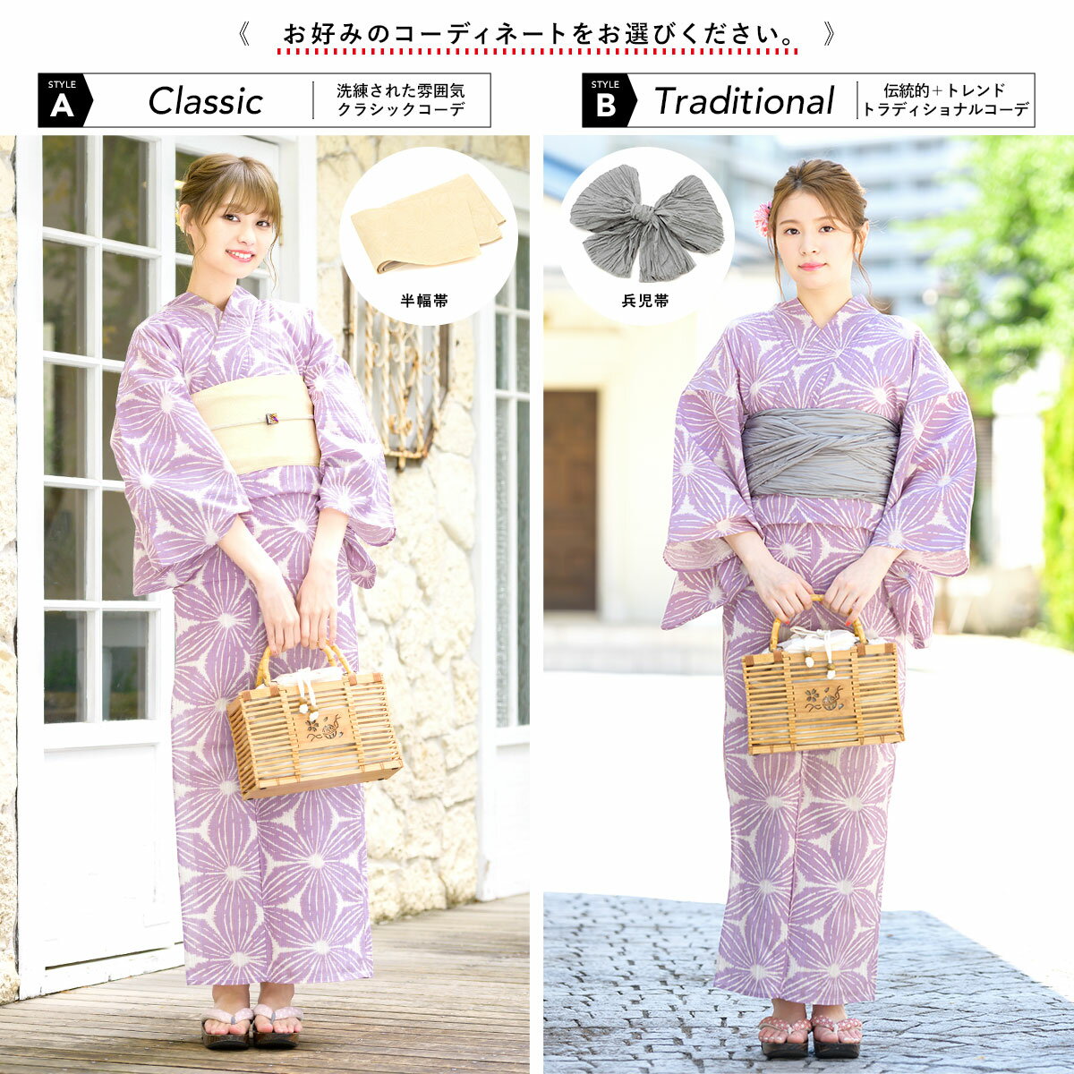 帯は、体に巻いて後ろで結ぶタイプの半幅帯と兵児帯、または作り帯からお選びいただけます。